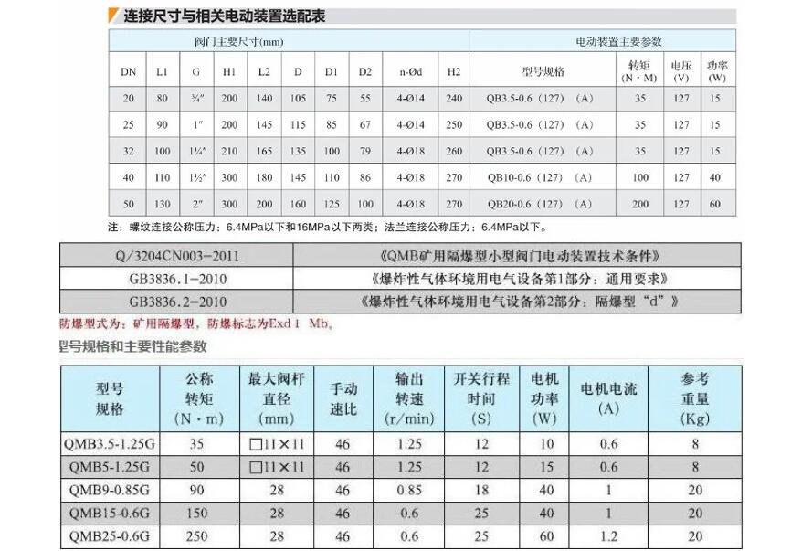 上海湖泉閥門集團(tuán)有限公司礦用小口徑電動球閥是一種由球體旋轉(zhuǎn)而開閉水路的新型礦用隔爆型電動球閥(以下簡稱電動球閥),由于其適應(yīng)的供水壓力范圍廣、不受泥沙、污水影響、供水通徑大、工作過程中通電時間短、工作穩(wěn)定可靠、是一種代用電磁閥的理想替代產(chǎn)品。 防爆型式:隔爆型;防爆標(biāo)志:ExdⅠ,是一種由球體旋轉(zhuǎn)而開閉水路的新型礦用隔爆型電動球閥(以下簡稱電動球閥),由于其適應(yīng)的供水壓力范圍廣、不受泥沙、污水影響、供水通徑大、工作過程中通電時間短、工作穩(wěn)定可靠、是一種代用電磁閥的理想替代產(chǎn)品。 防爆型式:隔爆型;防爆標(biāo)志:ExdⅠ。 執(zhí)行標(biāo)準(zhǔn):Q/ZLH07-2008、MT/715-1997標(biāo)準(zhǔn)。 正常工作條件: 電動閥應(yīng)在下列條件下可靠的工作: 海拔高度不超過2000m; 環(huán)境大氣壓80-110kPa; 環(huán)境溫度-20-+40℃; 周圍空氣相對濕度不大于95%(25℃時); 具有甲烷混合物及煤塵爆炸危險的煤礦井下; 在無顯著振動的地方; 在無破壞金屬絕緣的氣體和蒸氣的環(huán)境; 在無滴水的地方。是一種由球體旋轉(zhuǎn)而開閉水路的新型電動閥門,它由數(shù)字邏輯控制電路,方向控制電路,電流采樣控制電路,工作狀態(tài)指示電路等組成;接入24VDC電源后,控制端K1、K2有繼電器無源點控制球閥的開啟與關(guān)閉,K1與K2短接球閥打開,K1與K2斷開球閥關(guān)閉。由電流采樣控制電路檢測球閥的工作位置, 工作狀態(tài)指示電路指示球閥的工作狀態(tài): 球閥旋轉(zhuǎn)開啟,綠色LED亮;當(dāng)開啟到設(shè)定口徑時,黃燈亮(此時電機(jī)不耗電);當(dāng)球閥旋轉(zhuǎn)關(guān)閉時,紅燈亮(此時電機(jī)不耗電)。 四.主要技術(shù)參數(shù) 1. 防爆標(biāo)志: ExdⅠ 2. 輸入電壓: 24V DC. 3. 工作電流: ≤70mA DC. 4. 環(huán)境溫度: 0℃~40℃ 5. 環(huán)境濕度: ≤95%RH.(25℃時) 6. 大氣壓力: 80~110kPa 7. 水壓適應(yīng)范圍 : 0.2MPa~7.0MPa。 8. 水溫適應(yīng)范圍 : 0~60℃ 9. 球閥開啟速度 : 6s~12s 10。